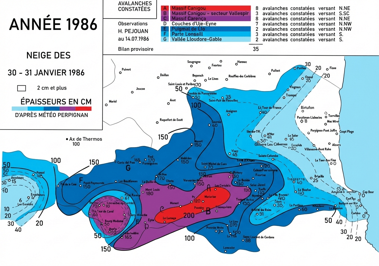 On a observé à Filliols 1,50 à 1,70 m de neige fraîche, 2 m à Mantet (à 1 500 m cependant) Au Puigmal, l’enneigement a été normal, sans plus. Neige abondante à Porte Puymorens, Andorre, mais là rien d’exceptionnel quant à la hauteur totale. Intensité de la chute de neige : 10 cm/heure à Py le 30 janvier à 18 h.