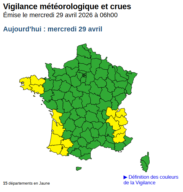 🟡 orages : Ain, Alpes de Haute Provence, Hautes Alpes, Charente Maritime, Côtes d’Armor, Finistère, Gers, Gironde, Isère, Landes, Morbihan, Pyrénées Atlantiques, Hautes Pyrénées, Savoie, Haute Savoie.